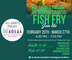 All Saints Parish Fish FryJoin us from 4:30 to 7:00pm each Friday during Lent at the St. Martin Campus Hall for a delicious Fish Fry Dinner.
